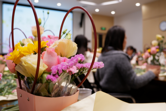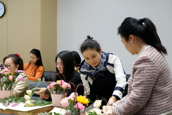 心灵手巧的女职工们纷纷动手,发挥自己的创意和想象。她们小心翼翼地修剪花枝,精心地搭配色彩,不一会儿,原本零散的花材在她们的手中逐渐变成了一件件精美的艺术品。有的作品简约而不失高雅,有的作品繁复而充满生机,每一束花都蕴含着创作者独特的情感和风格。